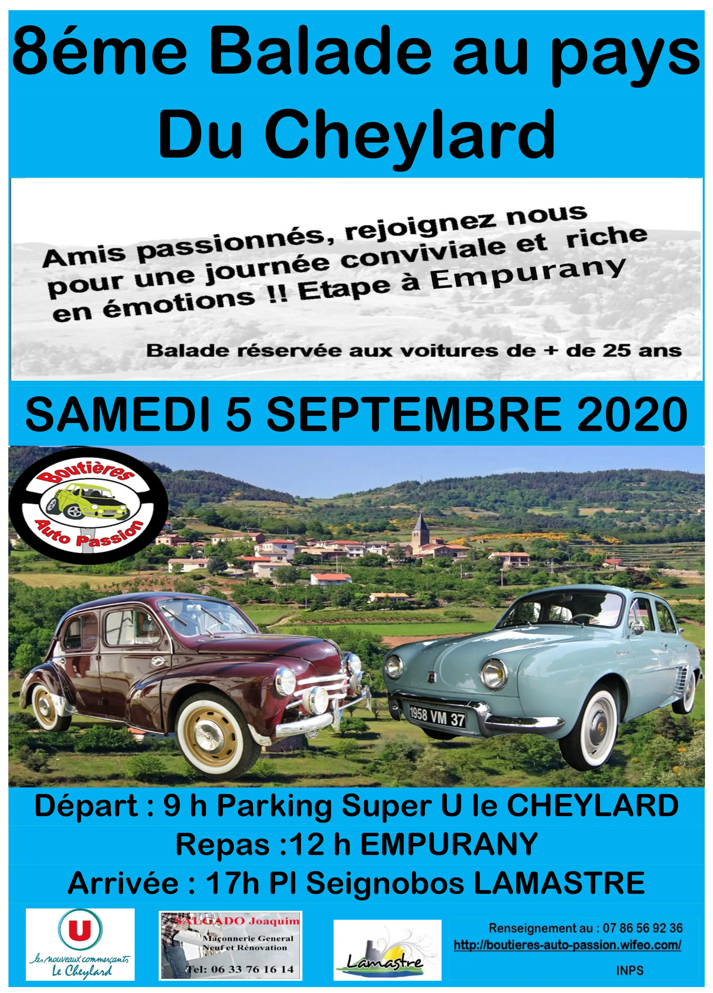 Auto passion : huitième balade au pays du Cheylard. Empurany le samedi 5 septembre à 12h00 Programme de la huitième balade au pays du Cheylard : 9h00 : départ parking Super U Le Cheylard 12h00 : repas à Empurany 17h00 : arrivée place Seignobos Lamastre Cliquer sur ce lien pour voir l’affiche. Par Corine Faure-Bassano|2020-09-01T14:58:31+02:001 septembre 2020|A la une, Non classifié(e)|0 commentaire