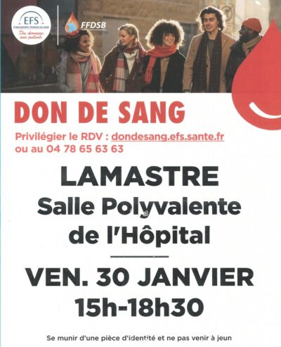 Don du sang à Lamastre le vendredi 30 janvier 2026 Par Corine Faure-Bassano|2026-01-05T09:49:48+01:005 janvier 2026|A la une|0 commentaire