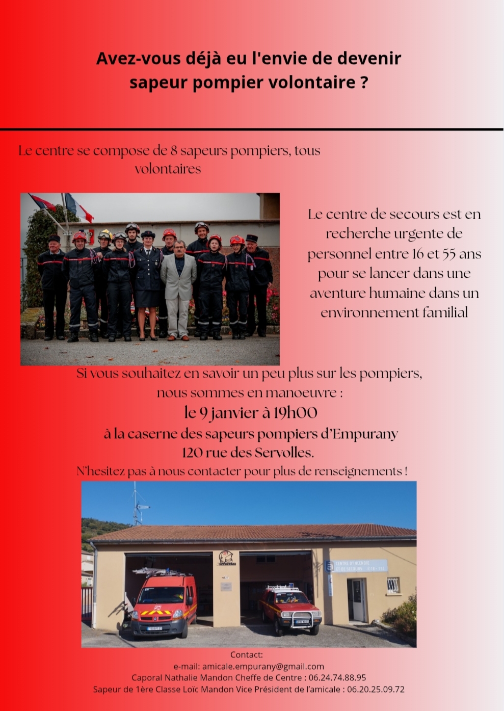 L’Amicale des Sapeurs pompiers d’Empurany est toujours en recherche active de personnel surtout ces dernières années, et s’il n’arrive pas à recruter et à pérenniser son activité le centre sera très sûrement voué à disparaitre !