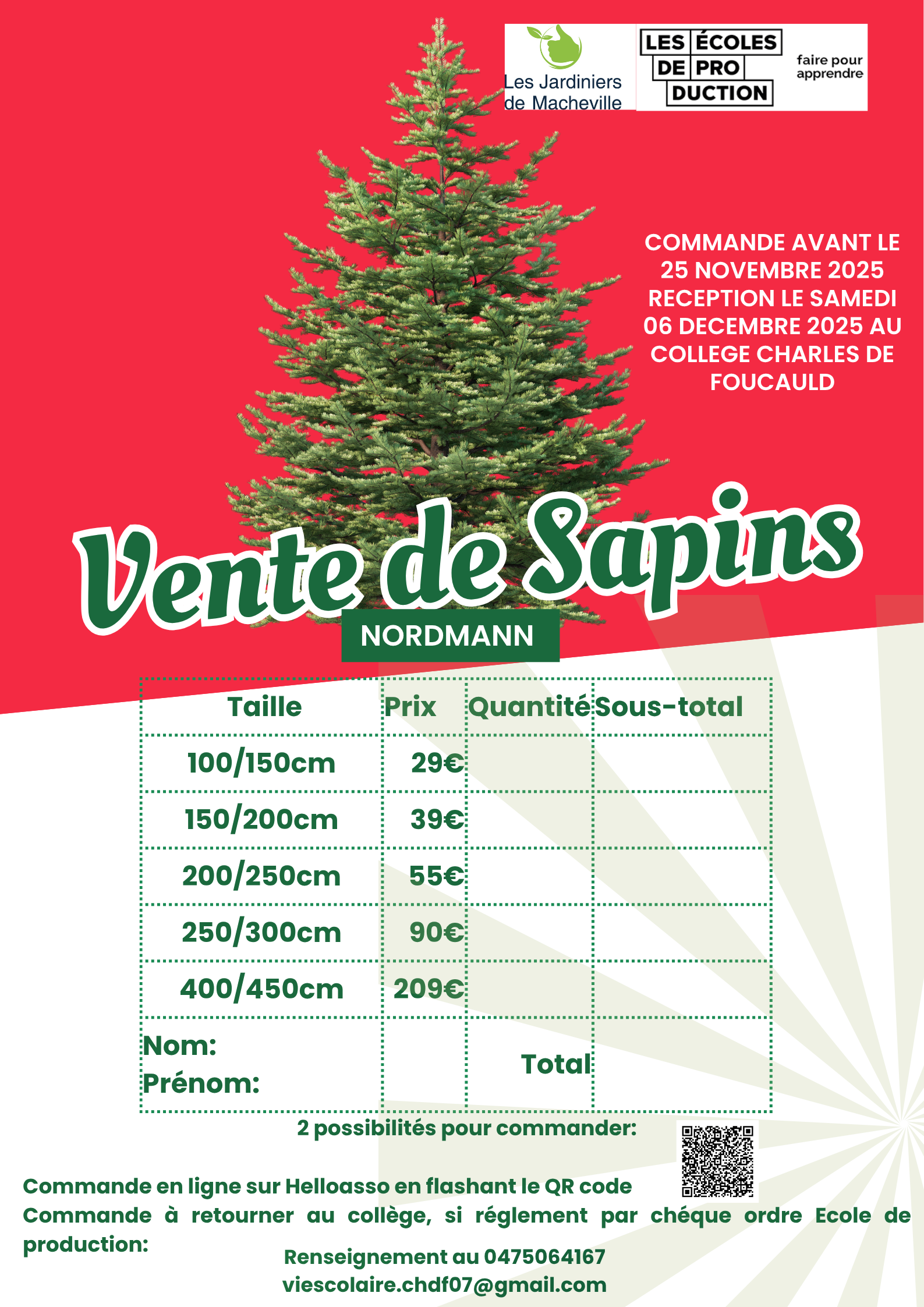 Vente de sapins de Noël par l’école de production Cliquez sur l’image pour l’agrandir. Les élèves de l’école de production vous proposent une vente de sapins de Noél pour embellir vos fêtes de fin d’année. Les bénéfices de cette vente serviront à soutenir les projets pédagogiques et les activités des élèves. Par Corine Faure-Bassano|2025-11-10T08:57:31+01:0010 novembre 2025|A la une|0 commentaire